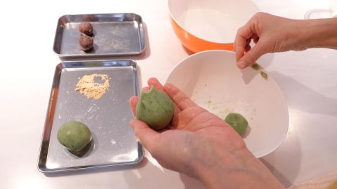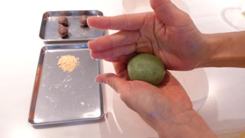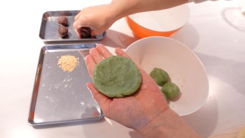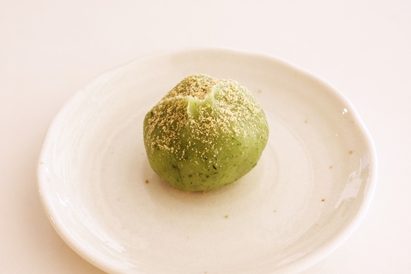 ※よもぎ生地は少し硬めなので、大きめに広げるのがポイントです - あんをのせて包み、閉じ口をしっかり閉じます