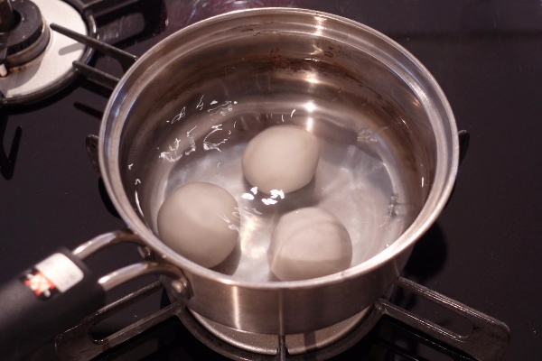 4. 沸騰したお湯に団子を入れ、弱火でゆでます。浮かんできたら1分ほど加熱し、ボウルに取り出しておきます