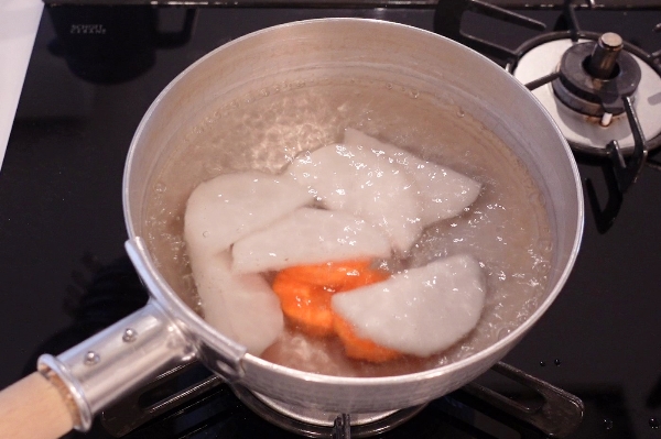 1. お椀に、大根(2枚)、人参(1枚)、あん団子(1個)を入れます。