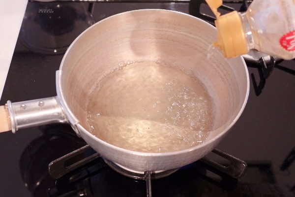 2. そのまま火にかけて加熱します。沸騰したら火を弱めて5分ほど煮出し、アクを取り除きます