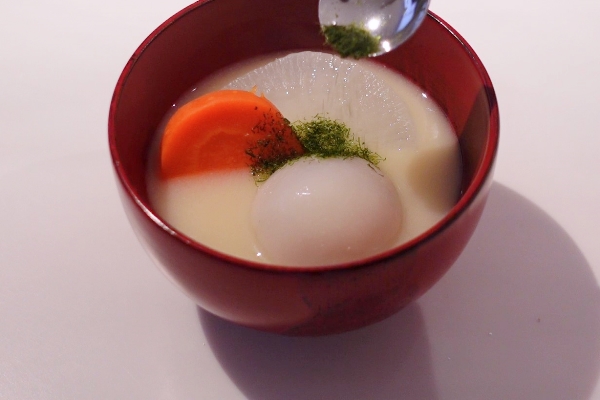 2. 上から白味噌出汁を注ぎ、青のりをふりかけて完成です