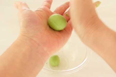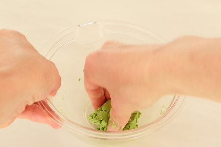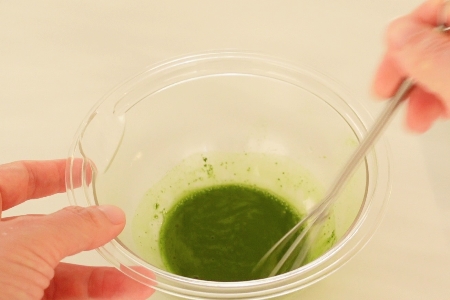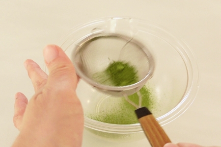 抹茶白玉団子:抹茶を茶こしでふるい、水と混ぜて抹茶水を作ります。白玉粉に加え、こねて2等分して丸めます。