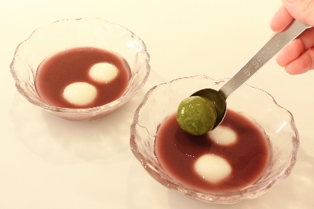 作り方はとても簡単。冷たいこしあんの汁粉に、白玉団子と抹茶白玉を浮かべるだけ。火を使うのは短時間なので、休日のおやつにもぴったりです。