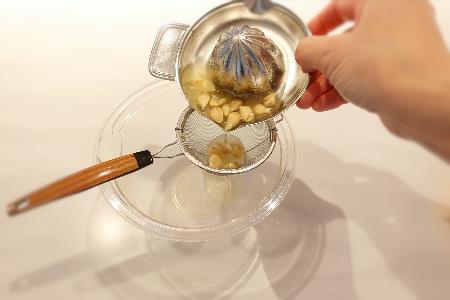 - 絞った果汁は茶漉しでこして、種や繊維を取り除きます。