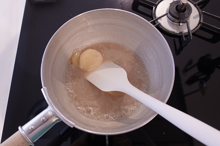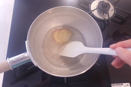 - 鍋に入れ、分量の水(150g)と生姜のスライスを入れます