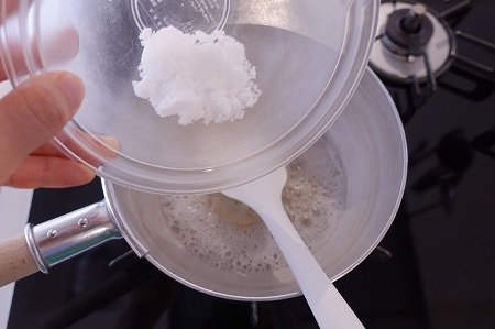 - 寒天が溶けたら、砂糖を加えます。砂糖が溶けたら火を止めます