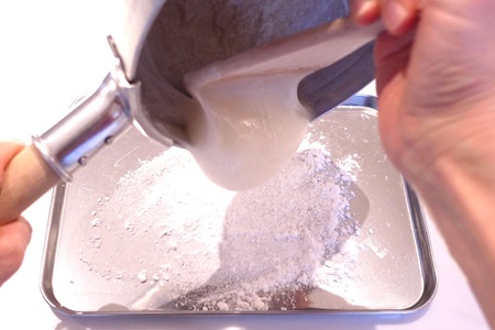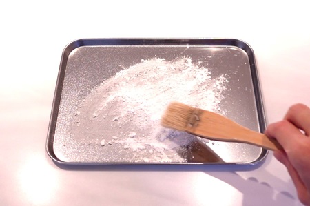 あんこラボパストリーゼなどの食品用アルコールを吹きかけてから片栗粉をのせると、粉がバットに吸着します