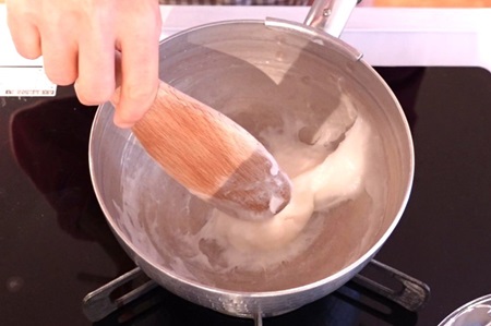 - 鍋を弱中火にかけ、木べらで練りながら加熱します