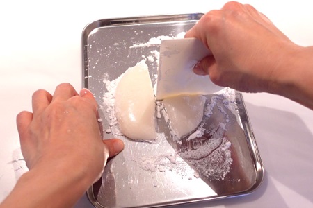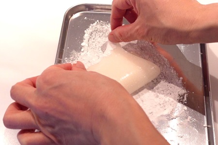 - 求肥をスケッパーで四角い形に整え、4等分し、切り口に手粉(片栗粉)をまぶします