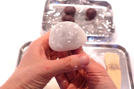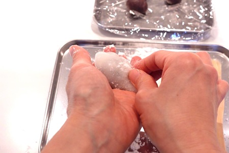 - もちを手に取り、あんをのせてひっくり返し、包みます