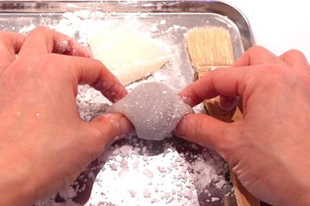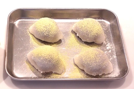 - 片栗粉を広げたバットに求肥を移し、二つ折りにして粗熱を取ります