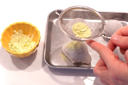- 青大豆きなこに抹茶を少量加え、うぐいすきなこを作ります