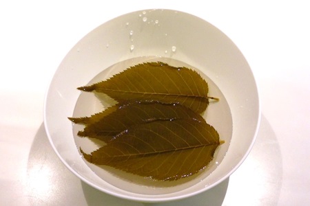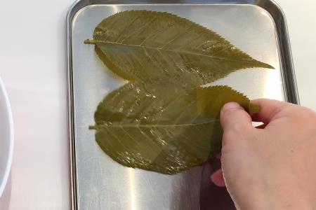 - 桜の葉の塩漬けを水に5分ほど漬け、塩抜きします