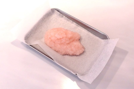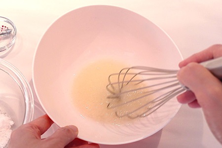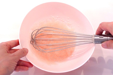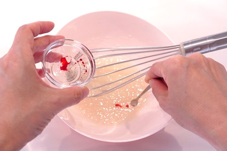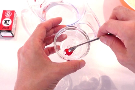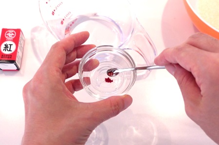 - 紅色素を少量の水で溶かし、少しずつ生地に加えて好みの桜色に着色します