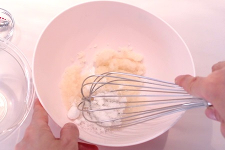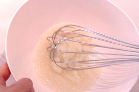 - 道明寺粉が水を吸ったら、上白糖を加えてさらに混ぜます