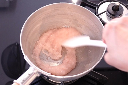 - 道明寺粉を鍋に入れ、弱~中火で加熱しながらゴムベラで混ぜます
