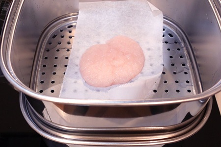※ 蒸している間に、あんを1個20gで丸め、ボウルに手水を用意しておきます。