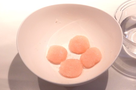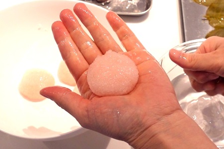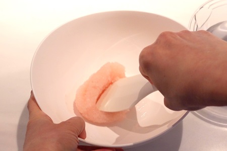- ボウルに道明寺粉と水を入れ、しっかりと混ぜます